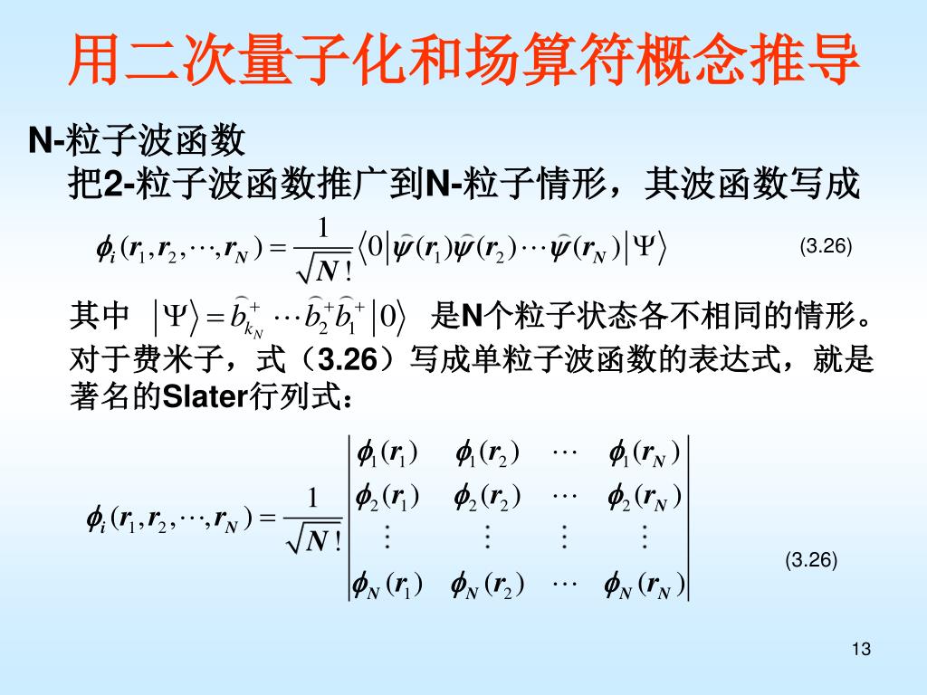 用二次量子化和场算符概念推导 N-粒子波函数 把2-粒子波函数推广到N-粒子情形,其波函数写成 (3.26) 其中 是N个粒子状态各不相同的情形。 对于费米子,式(3.26)写成单粒子波函数的表达式,就是 著名的Slater行列式: (3.26)