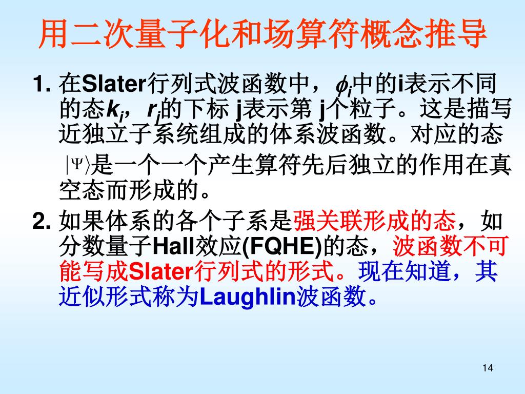 用二次量子化和场算符概念推导 • 在Slater行列式波函数中,i中的i表示不同的态ki,rj的下标 j表示第 j个粒子。这是描写近独立子系统组成的体系波函数。对应的态 是一个一个产生算符先后独立的作用在真空态而形成的。 2. 如果体系的各个子系是强关联形成的态,如分数量子Hall效应(FQHE)的态,波函数不可能写成Slater行列式的形式。现在知道,其近似形式称为Laughlin波函数。