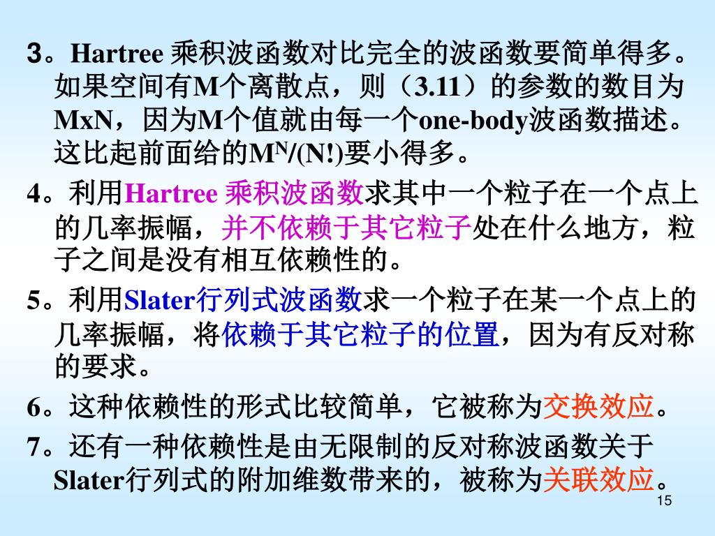 3。Hartree 乘积波函数对比完全的波函数要简单得多。如果空间有M个离散点,则(3.11)的参数的数目为MxN,因为M个值就由每一个one-body波函数描述。这比起前面给的MN/(N!)要小得多。 4。利用Hartree 乘积波函数求其中一个粒子在一个点上的几率振幅,并不依赖于其它粒子处在什么地方,粒子之间是没有相互依赖性的。 5。利用Slater行列式波函数求一个粒子在某一个点上的几率振幅,将依赖于其它粒子的位置,因为有反对称的要求。 6。这种依赖性的形式比较简单,它被称为交换效应。 7。还有一种依赖性是由无限制的反对称波函数关于Slater行列式的附加维数带来的,被称为关联效应。