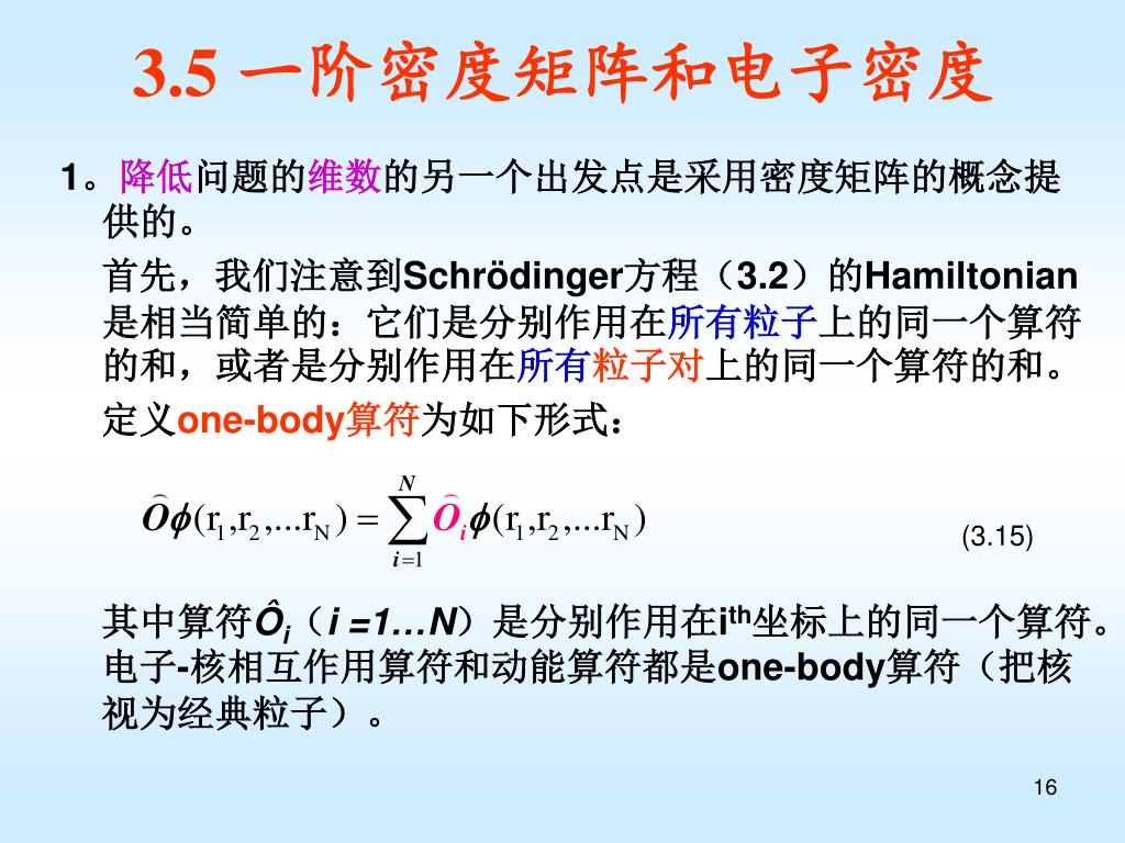 3.5 一阶密度矩阵和电子密度 1。降低问题的维数的另一个出发点是采用密度矩阵的概念提供的。 首先,我们注意到Schrödinger方程(3.2)的Hamiltonian是相当简单的:它们是分别作用在所有粒子上的同一个算符的和,或者是分别作用在所有粒子对上的同一个算符的和。 定义one-body算符为如下形式: (3.15) 其中算符Ôi(i =1…N)是分别作用在ith坐标上的同一个算符。 电子-核相互作用算符和动能算符都是one-body算符(把核 视为经典粒子)。