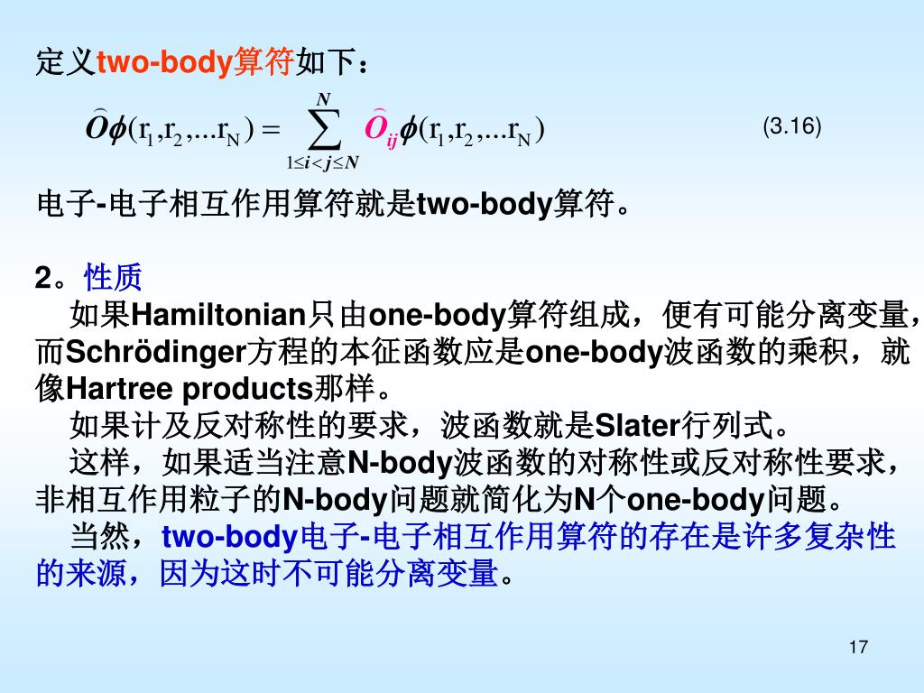 (3.16) 定义two-body算符如下: 电子-电子相互作用算符就是two-body算符。 2。性质 如果Hamiltonian只由one-body算符组成,便有可能分离变量,而Schrödinger方程的本征函数应是one-body波函数的乘积,就像Hartree products那样。 如果计及反对称性的要求,波函数就是Slater行列式。 这样,如果适当注意N-body波函数的对称性或反对称性要求,非相互作用粒子的N-body问题就简化为N个one-body问题。 当然,two-body电子-电子相互作用算符的存在是许多复杂性 的来源,因为这时不可能分离变量。