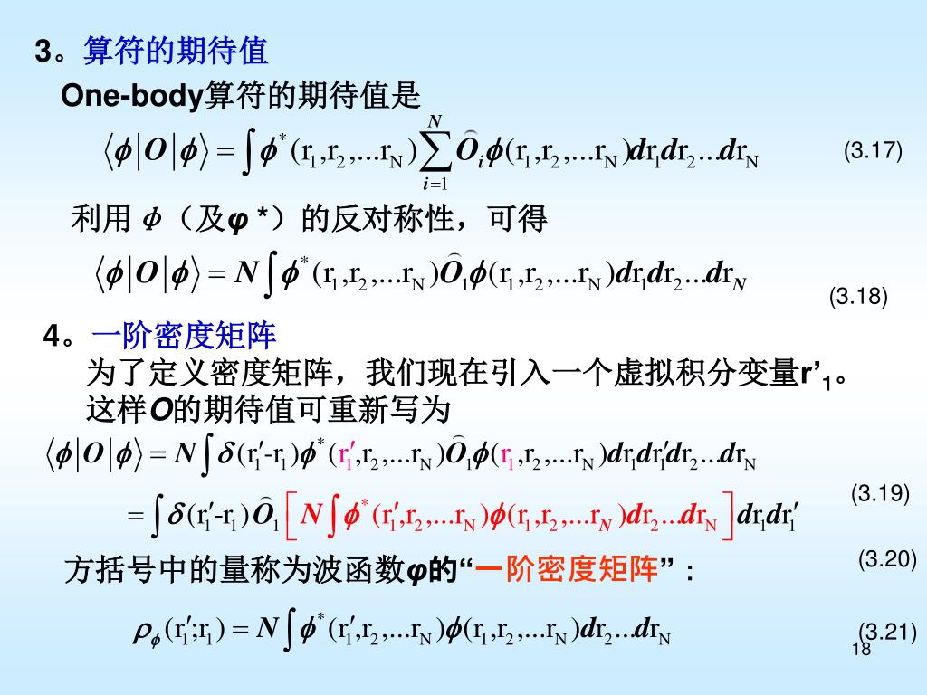 (3.17) 3。算符的期待值 One-body算符的期待值是 利用φ(及φ *)的反对称性,可得 (3.18) 4。一阶密度矩阵 为了定义密度矩阵,我们现在引入一个虚拟积分变量r’1。 这样O的期待值可重新写为 (3.19) (3.20) 方括号中的量称为波函数φ的“一阶密度矩阵”: (3.21)