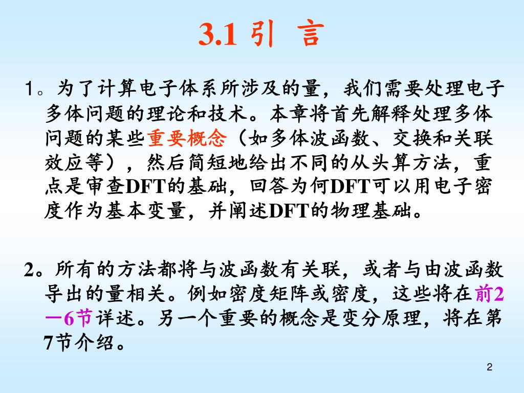 3.1 引 言 1。为了计算电子体系所涉及的量,我们需要处理电子多体问题的理论和技术。本章将首先解释处理多体问题的某些重要概念(如多体波函数、交换和关联效应等),然后简短地给出不同的从头算方法,重点是审查DFT的基础,回答为何DFT可以用电子密度作为基本变量,并阐述DFT的物理基础。 2。所有的方法都将与波函数有关联,或者与由波函数导出的量相关。例如密度矩阵或密度,这些将在前2-6节详述。另一个重要的概念是变分原理,将在第7节介绍。