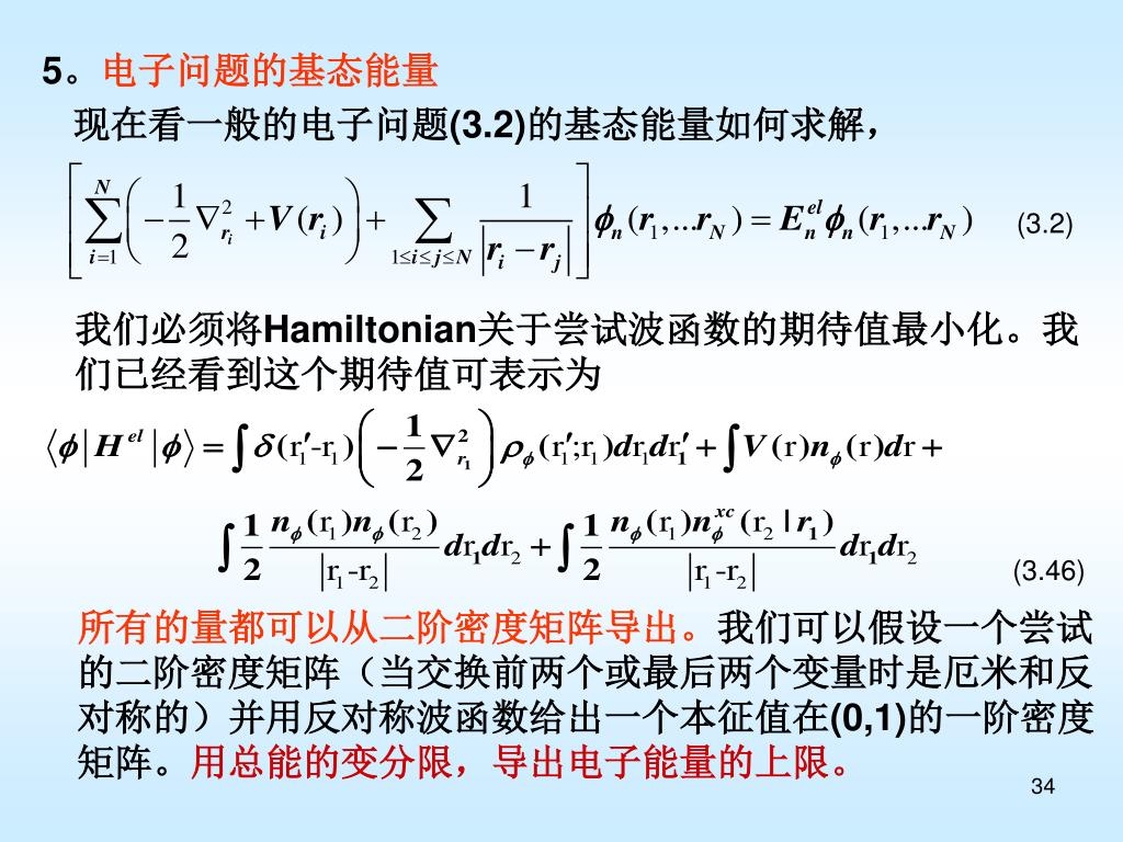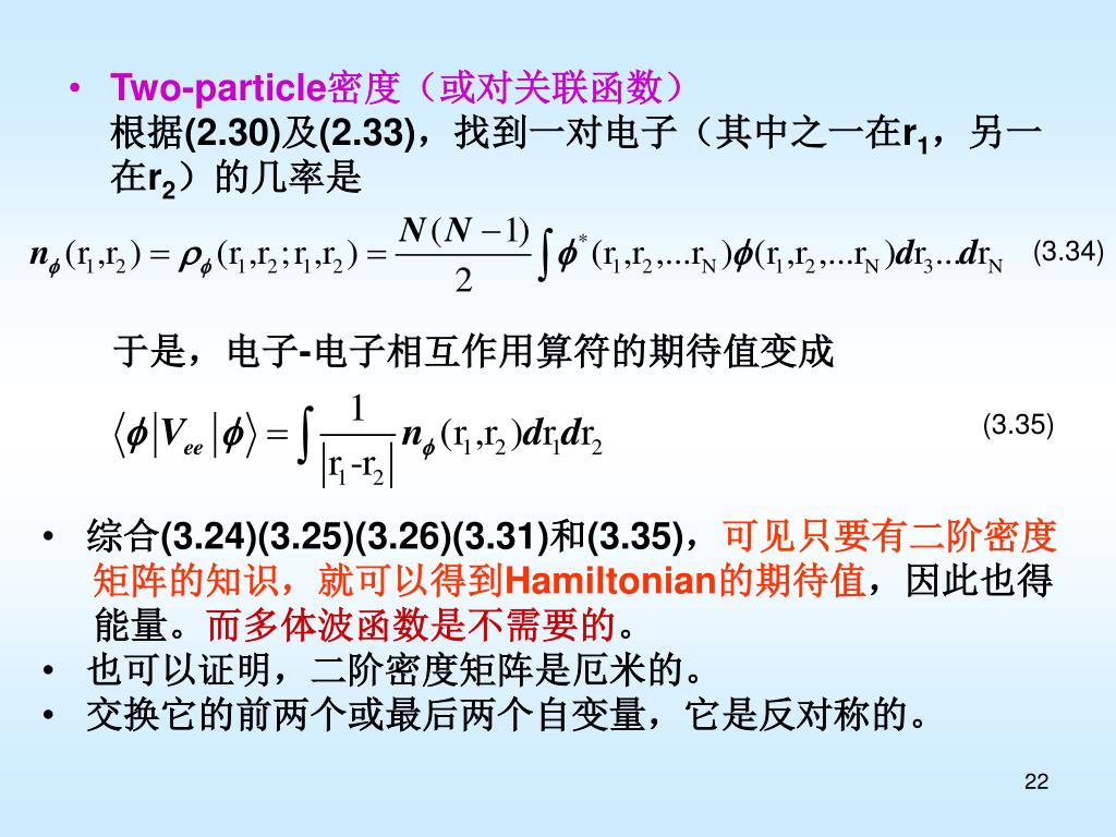 Two-particle密度(或对关联函数) 根据(2.30)及(2.33),找到一对电子(其中之一在r1,另一在r2)的几率是 (3.34) 于是,电子-电子相互作用算符的期待值变成 (3.35) • 综合(3.24)(3.25)(3.26)(3.31)和(3.35),可见只要有二阶密度 • 矩阵的知识,就可以得到Hamiltonian的期待值,因此也得 • 能量。而多体波函数是不需要的。 • 也可以证明,二阶密度矩阵是厄米的。 • 交换它的前两个或最后两个自变量,它是反对称的。