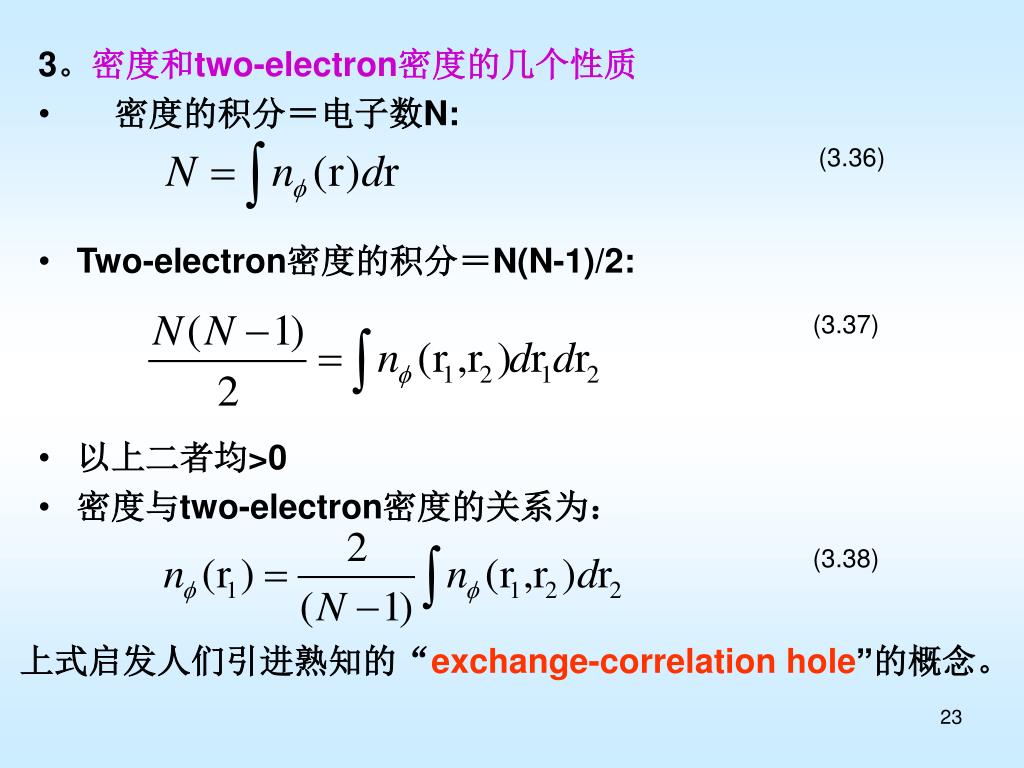 (3.36) 3。密度和two-electron密度的几个性质 • 密度的积分=电子数N: • Two-electron密度的积分=N(N-1)/2: • 以上二者均>0 • 密度与two-electron密度的关系为: (3.37) (3.38) 上式启发人们引进熟知的“exchange-correlation hole”的概念。