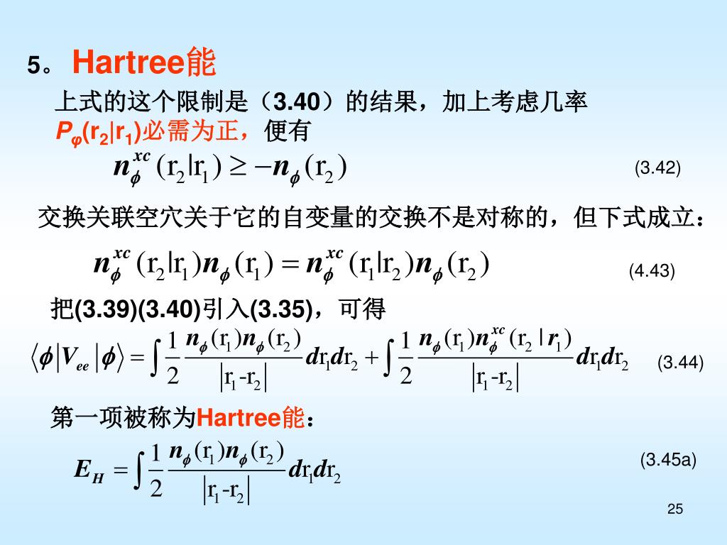 5。 Hartree能 上式的这个限制是(3.40)的结果,加上考虑几率Pφ(r2|r1)必需为正,便有 (3.42) 交换关联空穴关于它的自变量的交换不是对称的,但下式成立: (4.43) 把(3.39)(3.40)引入(3.35),可得 (3.44) 第一项被称为Hartree能: (3.45a)