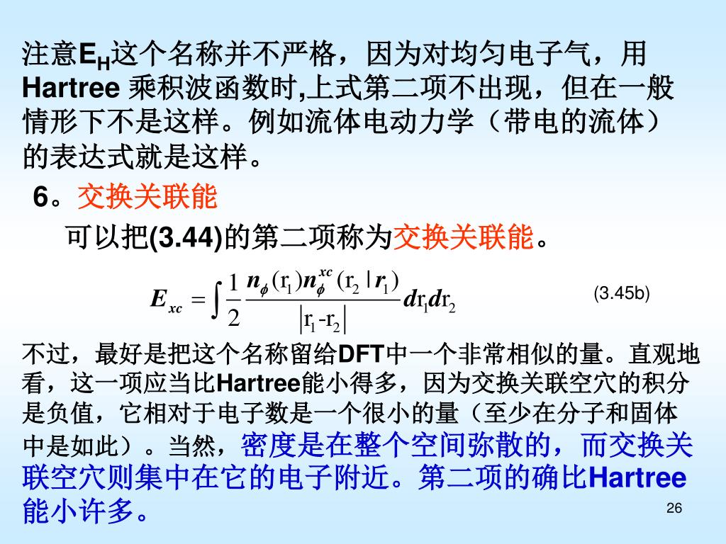 注意EH这个名称并不严格,因为对均匀电子气,用注意EH这个名称并不严格,因为对均匀电子气,用 Hartree 乘积波函数时,上式第二项不出现,但在一般 情形下不是这样。例如流体电动力学(带电的流体) 的表达式就是这样。 6。交换关联能 可以把(3.44)的第二项称为交换关联能。 (3.45b) 不过,最好是把这个名称留给DFT中一个非常相似的量。直观地看,这一项应当比Hartree能小得多,因为交换关联空穴的积分是负值,它相对于电子数是一个很小的量(至少在分子和固体中是如此)。当然,密度是在整个空间弥散的,而交换关联空穴则集中在它的电子附近。第二项的确比Hartree能小许多。