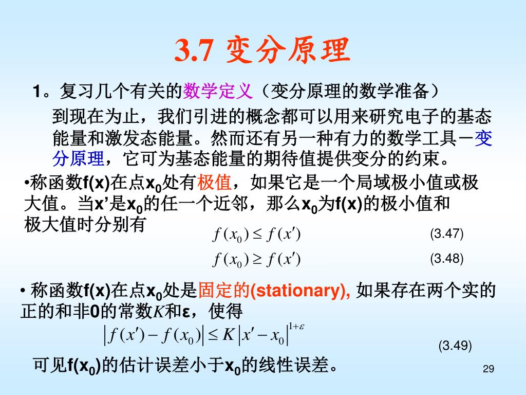 3.7 变分原理 1。复习几个有关的数学定义(变分原理的数学准备) 到现在为止,我们引进的概念都可以用来研究电子的基态能量和激发态能量。然而还有另一种有力的数学工具-变分原理,它可为基态能量的期待值提供变分的约束。 • 称函数f(x)在点x0处有极值,如果它是一个局域极小值或极 • 大值。当x’是x0的任一个近邻,那么x0为f(x)的极小值和 • 极大值时分别有 (3.47) (3.48) • 称函数f(x)在点x0处是固定的(stationary),如果存在两个实的 • 正的和非0的常数K和ε,使得 (3.49) 可见f(x0)的估计误差小于x0的线性误差。