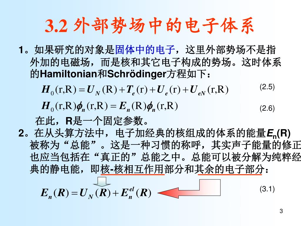 3.2 外部势场中的电子体系 1。如果研究的对象是固体中的电子,这里外部势场不是指外加的电磁场,而是核和其它电子构成的势场。这时体系的Hamiltonian和Schrödinger方程如下: (2.5) (2.6) 在此,R是一个固定参数。 2。在从头算方法中,电子加经典的核组成的体系的能量En(R) 被称为“总能”。这是一种习惯的称呼,其实声子能量的修正 也应当包括在“真正的”总能之中。总能可以被分解为纯粹经 典的静电能,即核-核相互作用部分和其余的电子部分: (3.1)