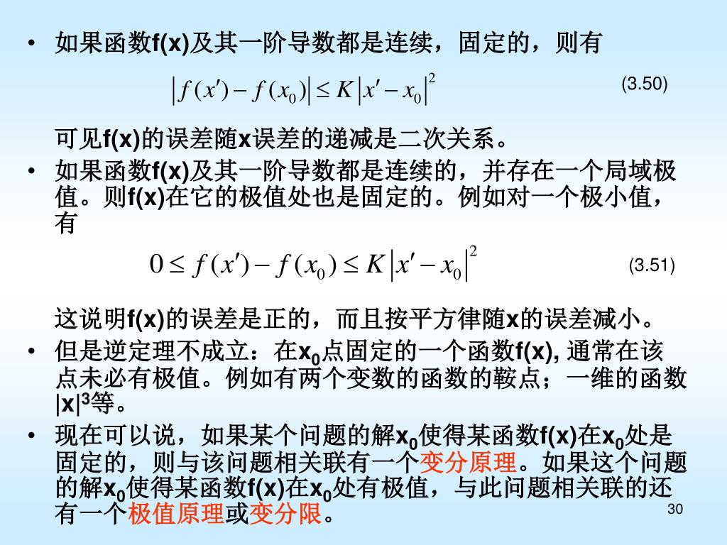 (3.50) • 如果函数f(x)及其一阶导数都是连续,固定的,则有 可见f(x)的误差随x误差的递减是二次关系。 • 如果函数f(x)及其一阶导数都是连续的,并存在一个局域极值。则f(x)在它的极值处也是固定的。例如对一个极小值,有 这说明f(x)的误差是正的,而且按平方律随x的误差减小。 • 但是逆定理不成立:在x0点固定的一个函数f(x), 通常在该点未必有极值。例如有两个变数的函数的鞍点;一维的函数|x|3等。 • 现在可以说,如果某个问题的解x0使得某函数f(x)在x0处是固定的,则与该问题相关联有一个变分原理。如果这个问题的解x0使得某函数f(x)在x0处有极值,与此问题相关联的还有一个极值原理或变分限。 (3.51)
