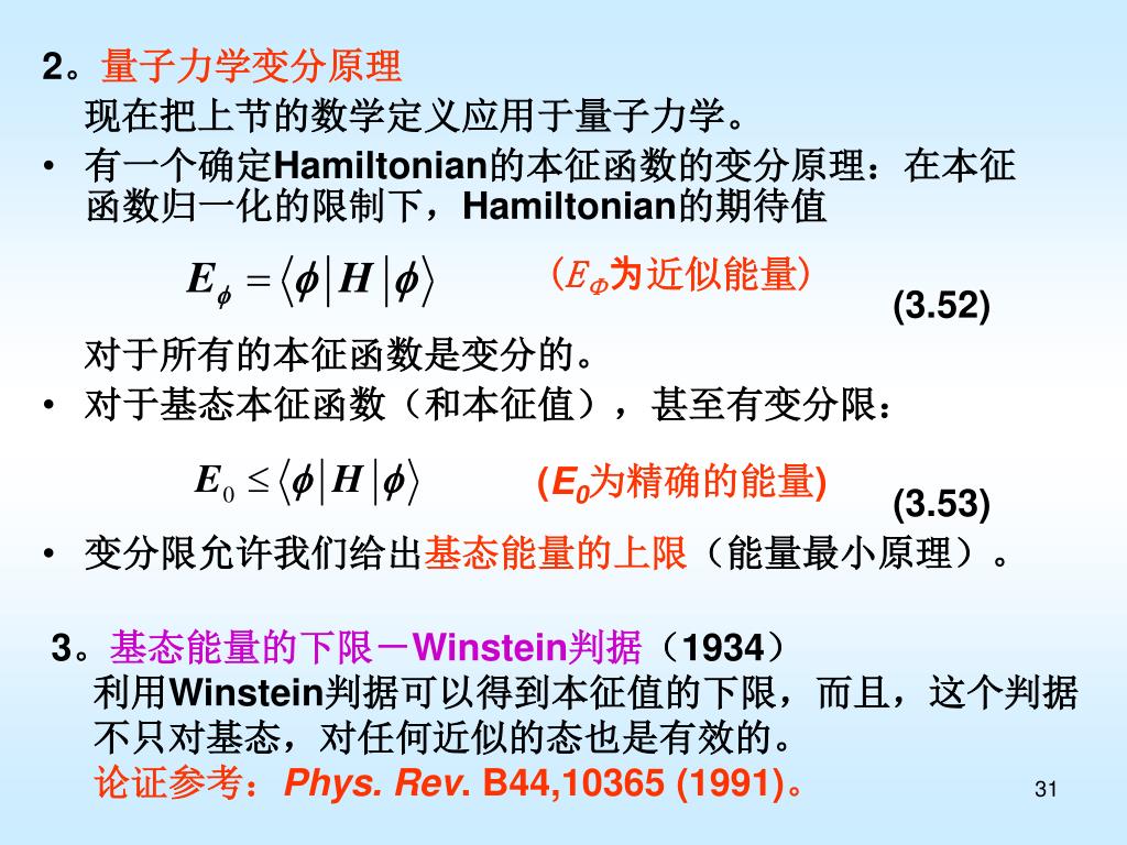 2。量子力学变分原理 现在把上节的数学定义应用于量子力学。 • 有一个确定Hamiltonian的本征函数的变分原理:在本征函数归一化的限制下,Hamiltonian的期待值 (3.52) 对于所有的本征函数是变分的。 • 对于基态本征函数(和本征值),甚至有变分限: (3.53) • 变分限允许我们给出基态能量的上限(能量最小原理)。 (EΦ为近似能量) (E0为精确的能量) 3。基态能量的下限-Winstein判据(1934) 利用Winstein判据可以得到本征值的下限,而且,这个判据 不只对基态,对任何近似的态也是有效的。 论证参考:Phys. Rev. B44,10365 (1991)。