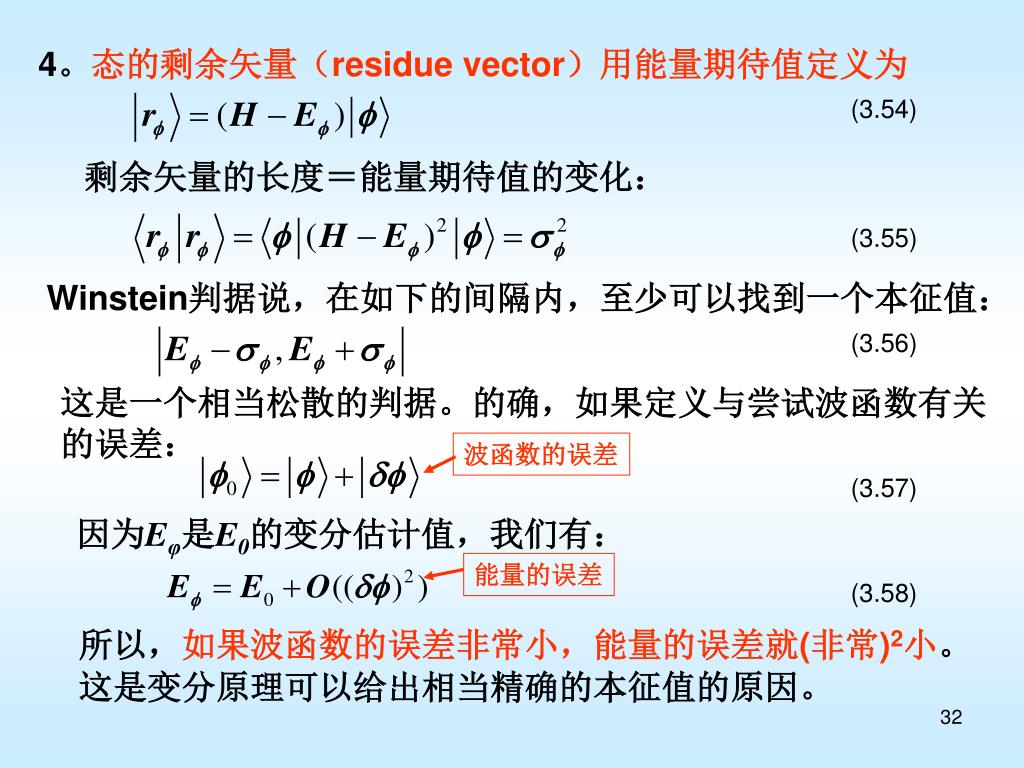 (3.54) 剩余矢量的长度=能量期待值的变化: 4。态的剩余矢量(residue vector)用能量期待值定义为 (3.55) Winstein判据说,在如下的间隔内,至少可以找到一个本征值: (3.56) 这是一个相当松散的判据。的确,如果定义与尝试波函数有关 的误差: 波函数的误差 (3.57) 因为Eφ是E0的变分估计值,我们有: 能量的误差 (3.58) 所以,如果波函数的误差非常小,能量的误差就(非常)2小。 这是变分原理可以给出相当精确的本征值的原因。