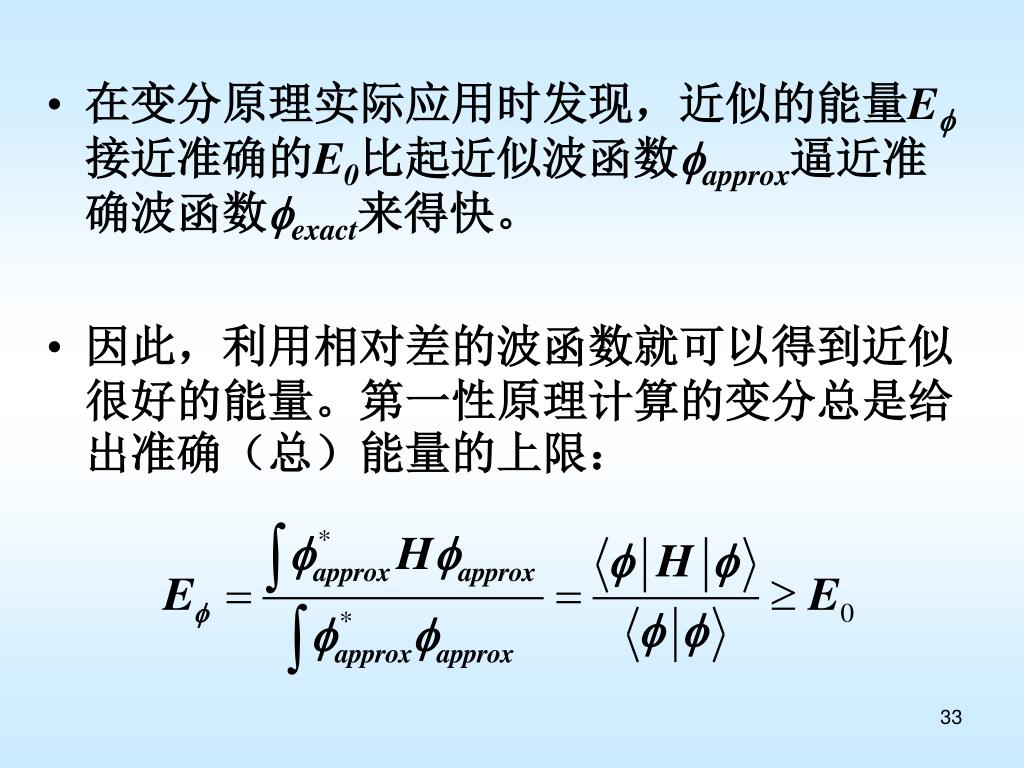 在变分原理实际应用时发现,近似的能量E接近准确的E0比起近似波函数approx逼近准确波函数exact来得快。在变分原理实际应用时发现,近似的能量E接近准确的E0比起近似波函数approx逼近准确波函数exact来得快。 • 因此,利用相对差的波函数就可以得到近似很好的能量。第一性原理计算的变分总是给出准确(总)能量的上限: