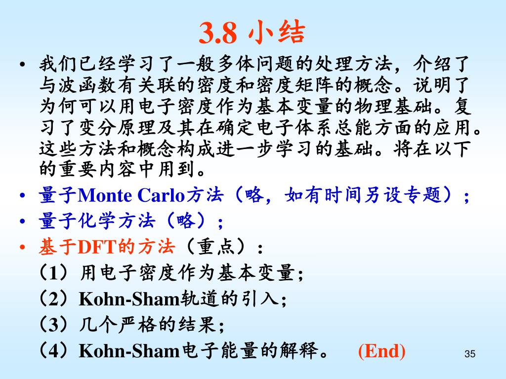 3.8 小结 • 我们已经学习了一般多体问题的处理方法,介绍了与波函数有关联的密度和密度矩阵的概念。说明了为何可以用电子密度作为基本变量的物理基础。复习了变分原理及其在确定电子体系总能方面的应用。这些方法和概念构成进一步学习的基础。将在以下的重要内容中用到。 • 量子Monte Carlo方法(略,如有时间另设专题); • 量子化学方法(略); • 基于DFT的方法(重点): (1)用电子密度作为基本变量; (2)Kohn-Sham轨道的引入; (3)几个严格的结果; (4)Kohn-Sham电子能量的解释。 (End)