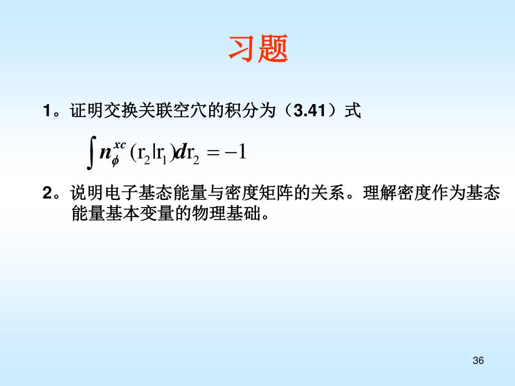 习题 1。证明交换关联空穴的积分为(3.41)式 2。说明电子基态能量与密度矩阵的关系。理解密度作为基态 能量基本变量的物理基础。