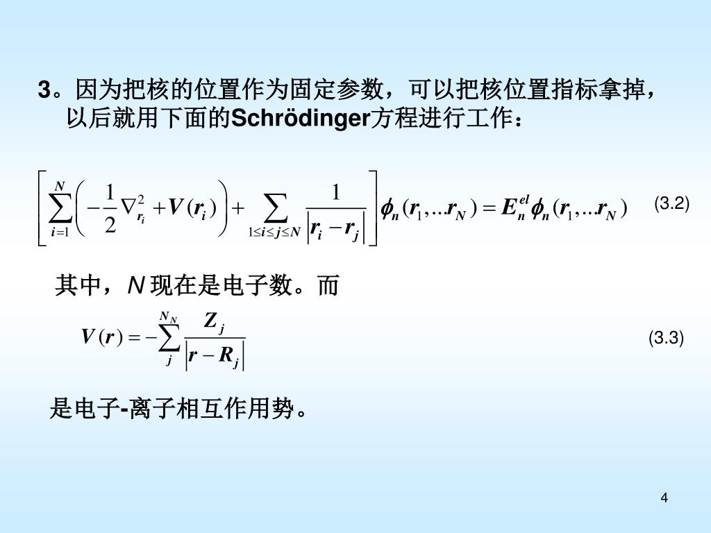3。因为把核的位置作为固定参数,可以把核位置指标拿掉,以后就用下面的Schrödinger方程进行工作:3。因为把核的位置作为固定参数,可以把核位置指标拿掉,以后就用下面的Schrödinger方程进行工作: (3.2) 其中,N 现在是电子数。而 (3.3) 是电子-离子相互作用势。