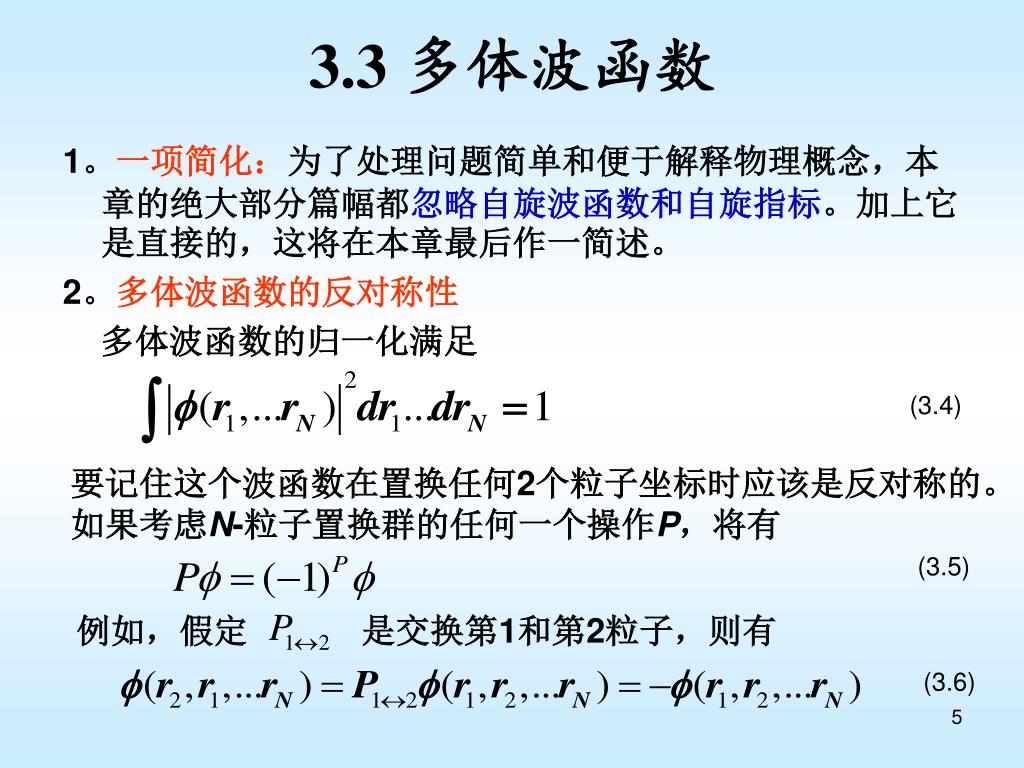 3.3 多体波函数 1。一项简化:为了处理问题简单和便于解释物理概念,本章的绝大部分篇幅都忽略自旋波函数和自旋指标。加上它是直接的,这将在本章最后作一简述。 2。多体波函数的反对称性 多体波函数的归一化满足 (3.4) 要记住这个波函数在置换任何2个粒子坐标时应该是反对称的。 如果考虑N-粒子置换群的任何一个操作P,将有 (3.5) 例如,假定 是交换第1和第2粒子,则有 (3.6)