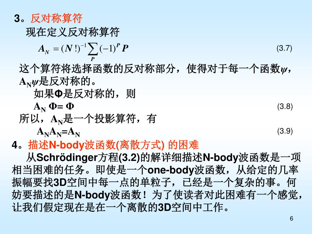 (3.7) 3。反对称算符 现在定义反对称算符 这个算符将选择函数的反对称部分,使得对于每一个函数ψ, ANψ是反对称的。 如果Φ是反对称的,则 ANΦ= Φ 所以,AN是一个投影算符,有 ANAN=AN (3.8) (3.9) 4。描述N-body波函数(离散方式) 的困难 从Schrödinger方程(3.2)的解详细描述N-body波函数是一项 相当困难的任务。即使是一个one-body波函数,从给定的几率 振幅要找3D空间中每一点的单粒子,已经是一个复杂的事。何 妨要描述的是N-body波函数!为了使读者对此困难有一个感觉, 让我们假定现在是在一个离散的3D空间中工作。