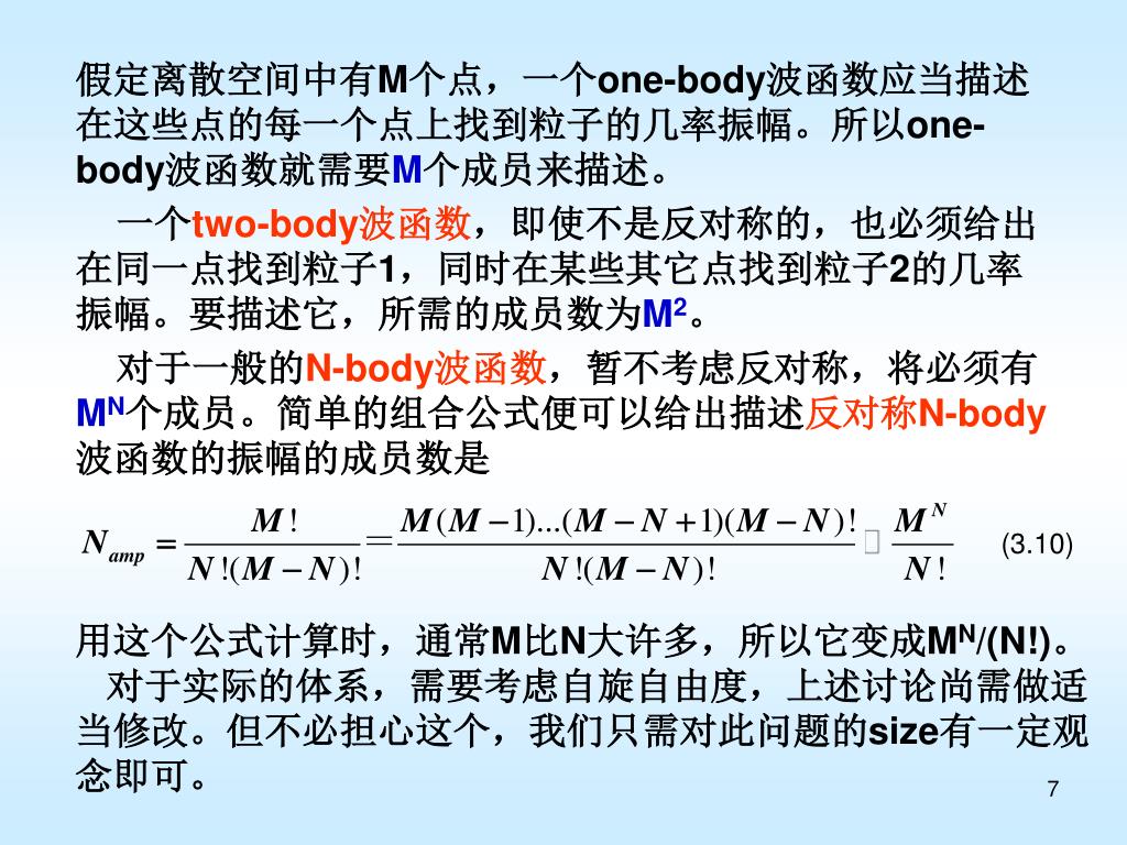 假定离散空间中有M个点,一个one-body波函数应当描述在这些点的每一个点上找到粒子的几率振幅。所以one-body波函数就需要M个成员来描述。假定离散空间中有M个点,一个one-body波函数应当描述在这些点的每一个点上找到粒子的几率振幅。所以one-body波函数就需要M个成员来描述。 一个two-body波函数,即使不是反对称的,也必须给出在同一点找到粒子1,同时在某些其它点找到粒子2的几率振幅。要描述它,所需的成员数为M2。 对于一般的N-body波函数,暂不考虑反对称,将必须有MN个成员。简单的组合公式便可以给出描述反对称N-body波函数的振幅的成员数是 (3.10) 用这个公式计算时,通常M比N大许多,所以它变成MN/(N!)。 对于实际的体系,需要考虑自旋自由度,上述讨论尚需做适 当修改。但不必担心这个,我们只需对此问题的size有一定观 念即可。