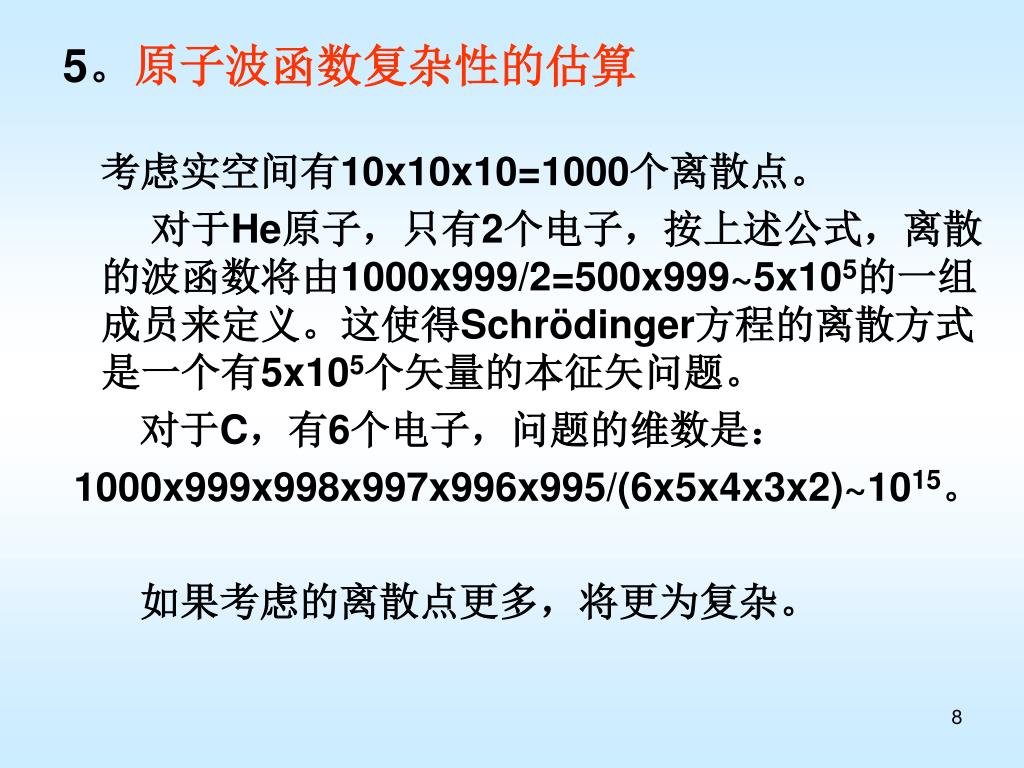 5。原子波函数复杂性的估算 考虑实空间有10x10x10=1000个离散点。 对于He原子,只有2个电子,按上述公式,离散的波函数将由1000x999/2=500x999~5x105的一组成员来定义。这使得Schrödinger方程的离散方式是一个有5x105个矢量的本征矢问题。 对于C,有6个电子,问题的维数是: 1000x999x998x997x996x995/(6x5x4x3x2)~1015。 如果考虑的离散点更多,将更为复杂。
