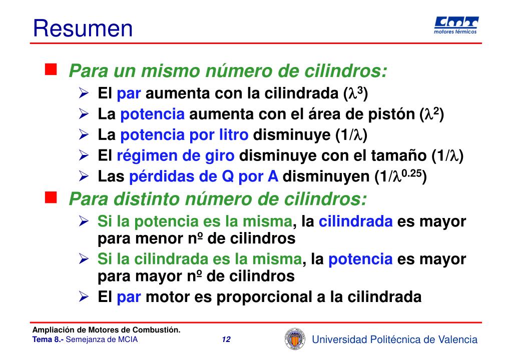 Consecuencias para distintoz • Si tienen la misma cilindrada: • Si tienen la misma potencia efectiva: El motor con cilindros más grandes tiene menos cilindros pero más cilindrada El motor con cilindros más grandes tiene menos cilindros y menos potencia Ampliación de Motores de Combustión. Tema 8.- Semejanza de MCIA 11