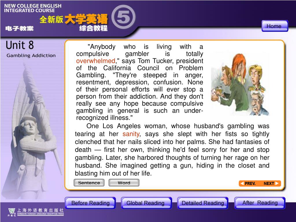 TEXT-S-3.2 And their numbers are soaring as gambling explodes across America, from the mega-resorts of Las Vegas to the gaming parlors of Indian reservations, from the riverboats along the Mississippi to the corner mini-marts selling lottery tickets. With nearly every state in the union now sanctioning some form of legalized gambling to raise revenues, evidence is mounting that society is paying a steep price, one that some researchers say must be confronted, if not reversed. Never before have bettors blown so much money — a whopping $50.9 billion last year — five times the amount lost in 1980. That's more than the public spent on movies, theme parks, recorded music and sporting events combined. A substantial share of those gambling losses — an estimated 30% to 40% — pours from the pockets and purses of chronic losers hooked on the adrenaline rush of risking their money, intoxicated by the fast action of gambling's incandescent world. 1. Analyze the structure of the sentence. The subject of the sentence is “share”, and the predicate is “pours”. The phrase between the dashes “an estimated 30% to 40%” is an inserted noun phrase to explain how much the share of the losses is. The two past participle phrases “hooked on … money” and “intoxicated by … world” modify “chronic losers”. 2. Translate the sentence into Chinese. 输掉的赌金中有相当一部分—— 约占30%-40%—— 是从那些常输的赌徒的钱包里掏出来的,赌博带来的兴奋令他们入迷,瞬息万变的赌博世界令他们如痴如醉。