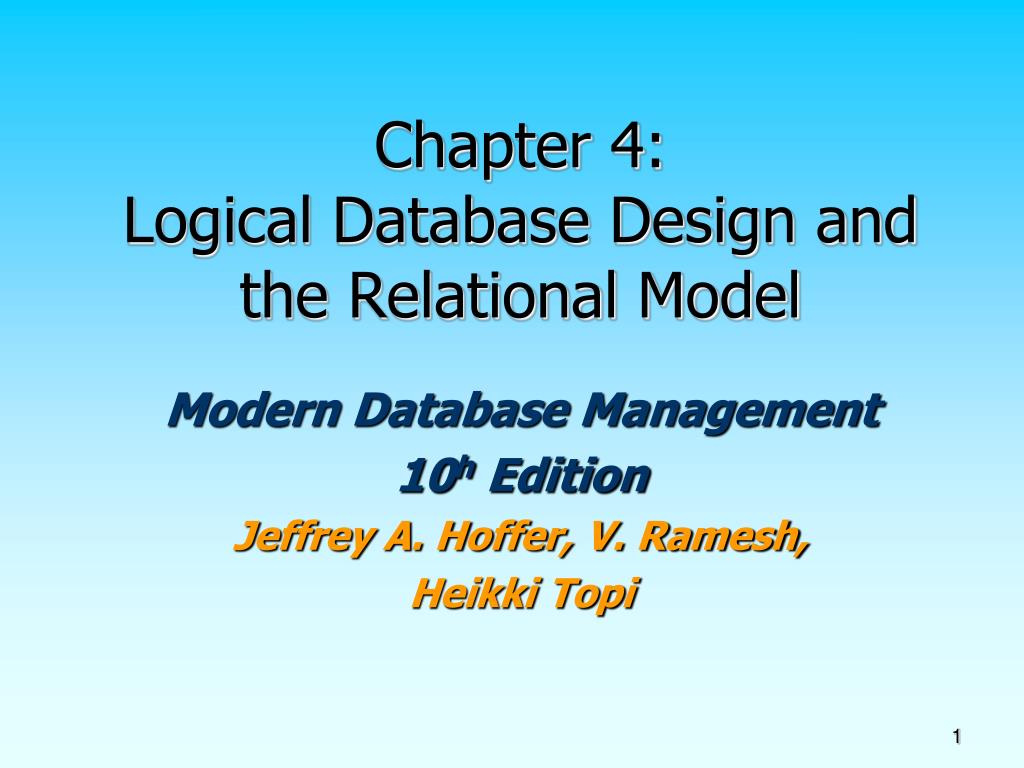 Chapter 4:Logical Database Design and the Relational Model Modern Database Management 10h Edition Jeffrey A. Hoffer, V. Ramesh, Heikki Topi