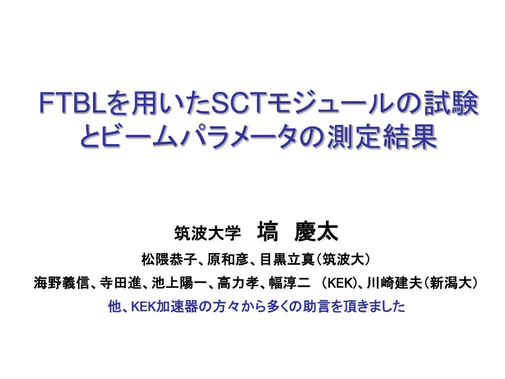 FTBLを用いたSCTモジュールの試験とビームパラメータの測定結果FTBLを用いたSCTモジュールの試験とビームパラメータの測定結果 筑波大学 塙 慶太 松隈恭子、原和彦、目黒立真(筑波大) 海野義信、寺田進、池上陽一、高力孝、幅淳二 (KEK)、川崎建夫(新潟大) 他、KEK加速器の方々から多くの助言を頂きました