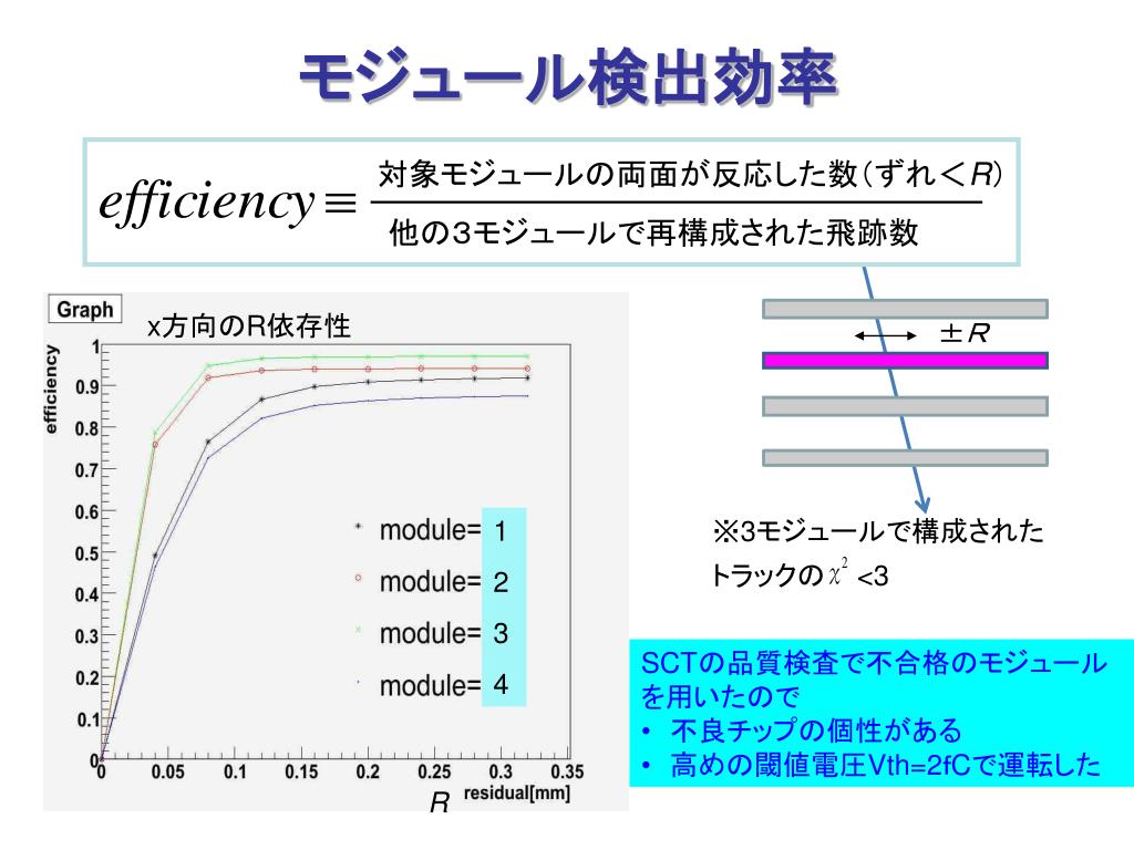 モジュール検出効率 ※3モジュールで構成された トラックの <3 対象モジュールの両面が反応した数(ずれ<R) 他の3モジュールで再構成された飛跡数 x方向のR依存性 ±R 1 2 3 4 • SCTの品質検査で不合格のモジュールを用いたので • 不良チップの個性がある • 高めの閾値電圧Vth=2fCで運転した R