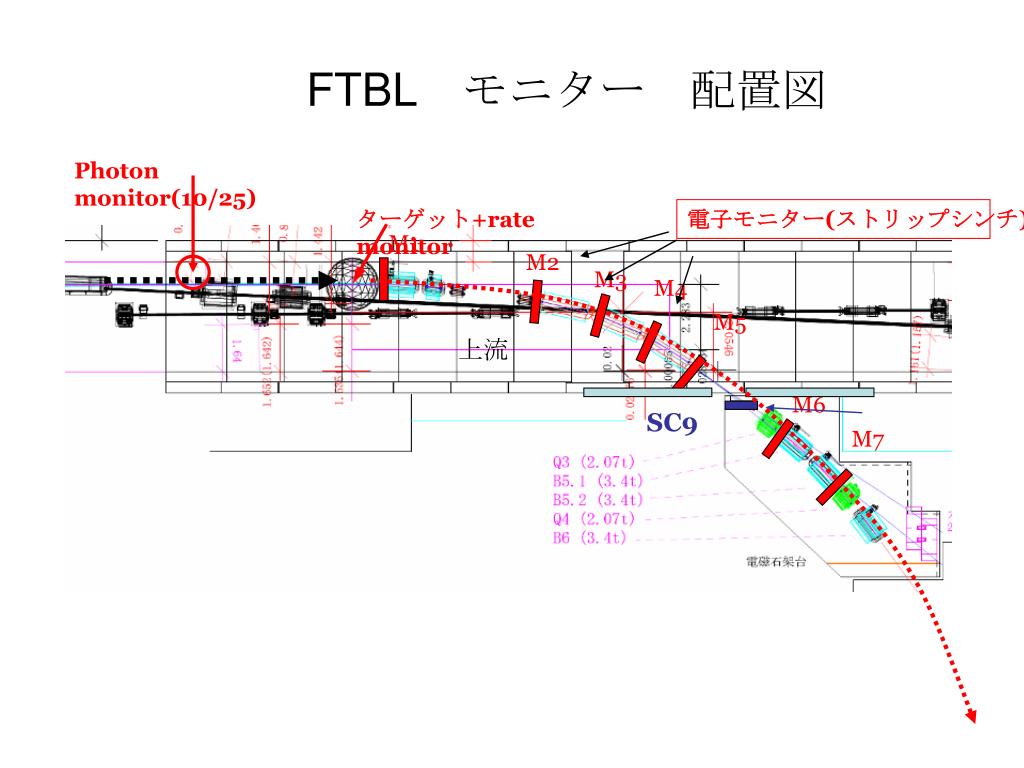 FTBL モニター 配置図 Photon monitor(10/25) ターゲット+rate monitor 電子モニター(ストリップシンチ) M1 M2 M3 M4 M5 上流 M6 SC9 M7