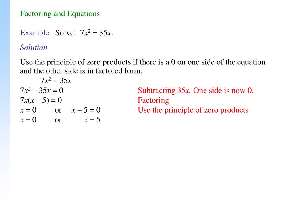 Factoring and Equations Example Solve: 7x2 = 35x. Solution Use the principle of zero products if there is a 0 on one side of the equation and the other side is in factored form. 7x2 = 35x 7x2 – 35x = 0 Subtracting 35x. One side is now 0. 7x(x – 5) = 0 Factoring x = 0 or x – 5 = 0 Use the principle of zero products x = 0 or x = 5 To Use the Principle of Zero Products 1. Write an equivalent equation with 0 on one side, using the addition principle. 2. Factor the polynomial completely. 3. Set each factor that is not a constant equal to 0. 4. Solve the resulting equations.