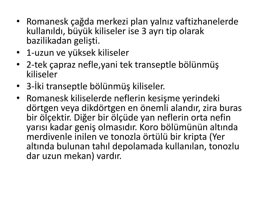 Romanesk çağda merkezi plan yalnız vaftizhanelerde kullanıldı, büyük kiliseler ise 3 ayrı tip olarak bazilikadan gelişti. • 1-uzun ve yüksek kiliseler • 2-tek çapraz nefle,yani tek transeptle bölünmüş kiliseler • 3-İki transeptle bölünmüş kiliseler. • Romanesk kiliselerde neflerin kesişme yerindeki dörtgen veya dikdörtgen en önemli alandır, zira buras bir ölçektir. Diğer bir ölçüde yan neflerin orta nefin yarısı kadar geniş olmasıdır. Koro bölümünün altında merdivenle inilen ve tonozla örtülü bir kripta (Yer altında bulunan tahıl depolamada kullanılan, tonozlu dar uzun mekan) vardır.