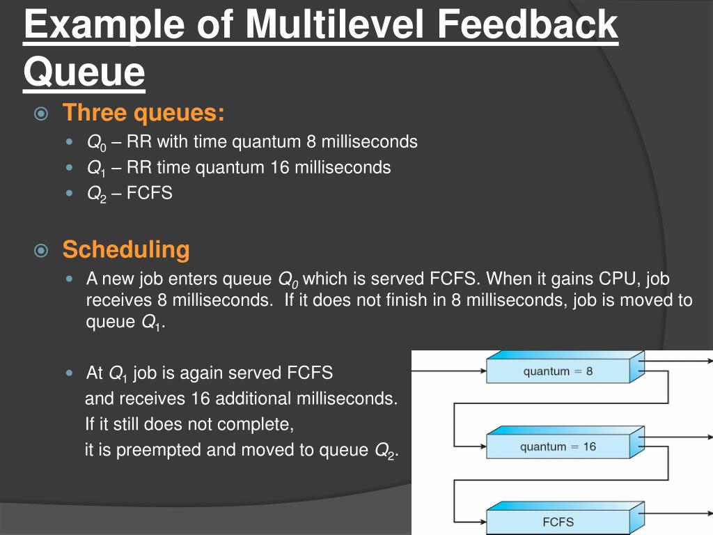 Example of Multilevel Feedback Queue • Three queues: • Q0 – RR with time quantum 8 milliseconds • Q1 – RR time quantum 16 milliseconds • Q2 – FCFS • Scheduling • A new job enters queue Q0which is servedFCFS. When it gains CPU, job receives 8 milliseconds. If it does not finish in 8 milliseconds, job is moved to queue Q1. • At Q1 job is again served FCFS and receives 16 additional milliseconds. If it still does not complete, it is preempted and moved to queue Q2.