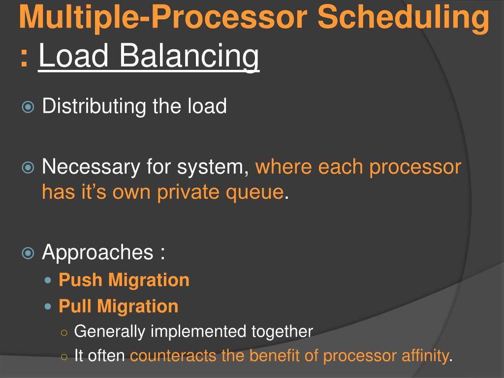 Multiple-Processor Scheduling : Load Balancing • Distributing the load • Necessary for system, where each processor has it’s own private queue. • Approaches : • Push Migration • Pull Migration • Generally implemented together • It often counteracts the benefit of processor affinity.