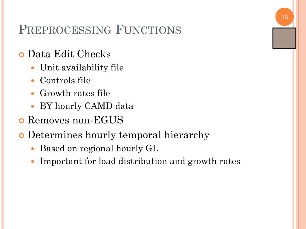 Preprocessing Functions • Data Edit Checks • Unit availability file • Controls file • Growth rates file • BY hourly CAMD data • Removes non-EGUS • Determines hourly temporal hierarchy • Based on regional hourly GL • Important for load distribution and growth rates