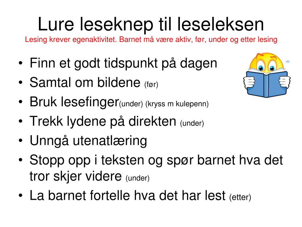 Lure leseknep til leseleksenLesing krever egenaktivitet. Barnet må være aktiv, før, under og etter lesing • Finn et godt tidspunkt på dagen • Samtal om bildene (før) • Bruk lesefinger(under) (kryss m kulepenn) • Trekk lydene på direkten (under) • Unngå utenatlæring • Stopp opp i teksten og spør barnet hva det tror skjer videre (under) • La barnet fortelle hva det har lest (etter)