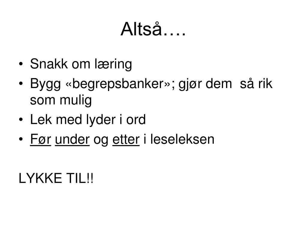 Altså…. • Snakk om læring • Bygg «begrepsbanker»; gjør dem så rik som mulig • Lek med lyder i ord • Førunder og etter i leseleksen LYKKE TIL!!