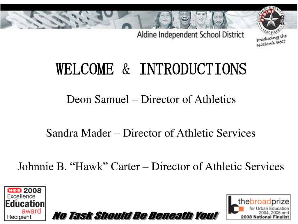 WELCOME & INTRODUCTIONS Deon Samuel – Director of Athletics Sandra Mader – Director of Athletic Services Johnnie B. “Hawk” Carter – Director of Athletic Services No Task Should Be Beneath You!