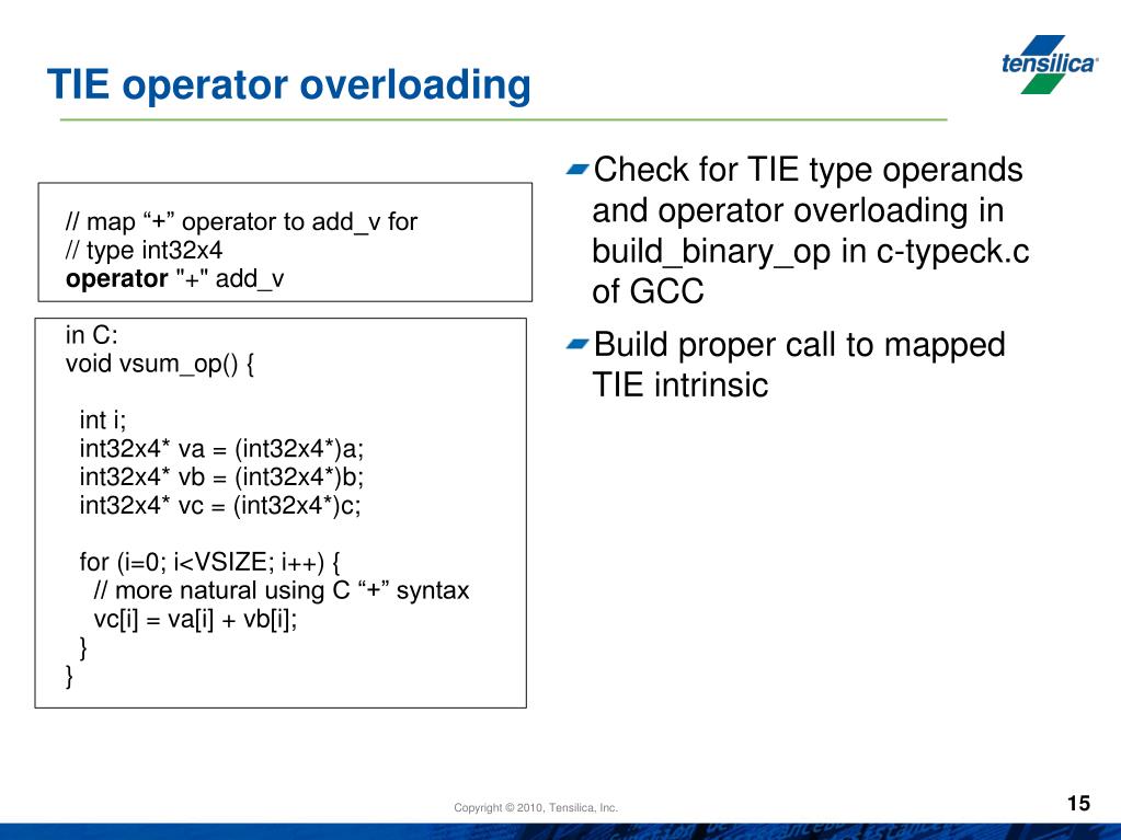 TIE operator overloading • Check for TIE type operands and operator overloading in build_binary_op in c-typeck.c of GCC • Build proper call to mapped TIE intrinsic // map “+” operator to add_v for // type int32x4 operator "+" add_v in C: void vsum_op() { int i; int32x4* va = (int32x4*)a; int32x4* vb = (int32x4*)b; int32x4* vc = (int32x4*)c; for (i=0; i<VSIZE; i++) { // more natural using C “+” syntax vc[i] = va[i] + vb[i]; } }