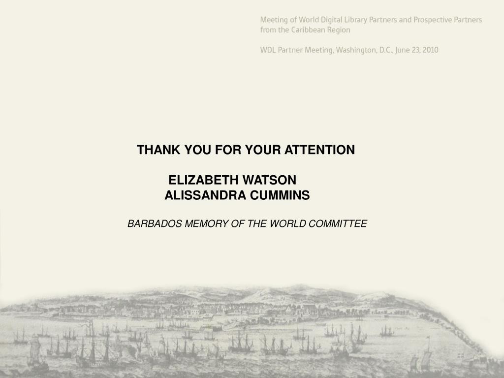 THANK YOU FOR YOUR ATTENTION ELIZABETH WATSON ALISSANDRA CUMMINS BARBADOS MEMORY OF THE WORLD COMMITTEE