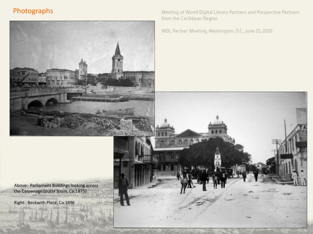 Photographs Above: Parliament Buildings looking across the Careenage (outer basin, Ca.1875) Right: Beckwith Place, Ca.1896