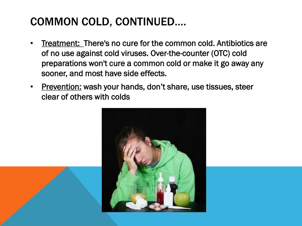Common Cold, continued…. • Treatment: There's no cure for the common cold. Antibiotics are of no use against cold viruses. Over-the-counter (OTC) cold preparations won't cure a common cold or make it go away any sooner, and most have side effects. • Prevention: wash your hands, don’t share, use tissues, steer clear of others with colds