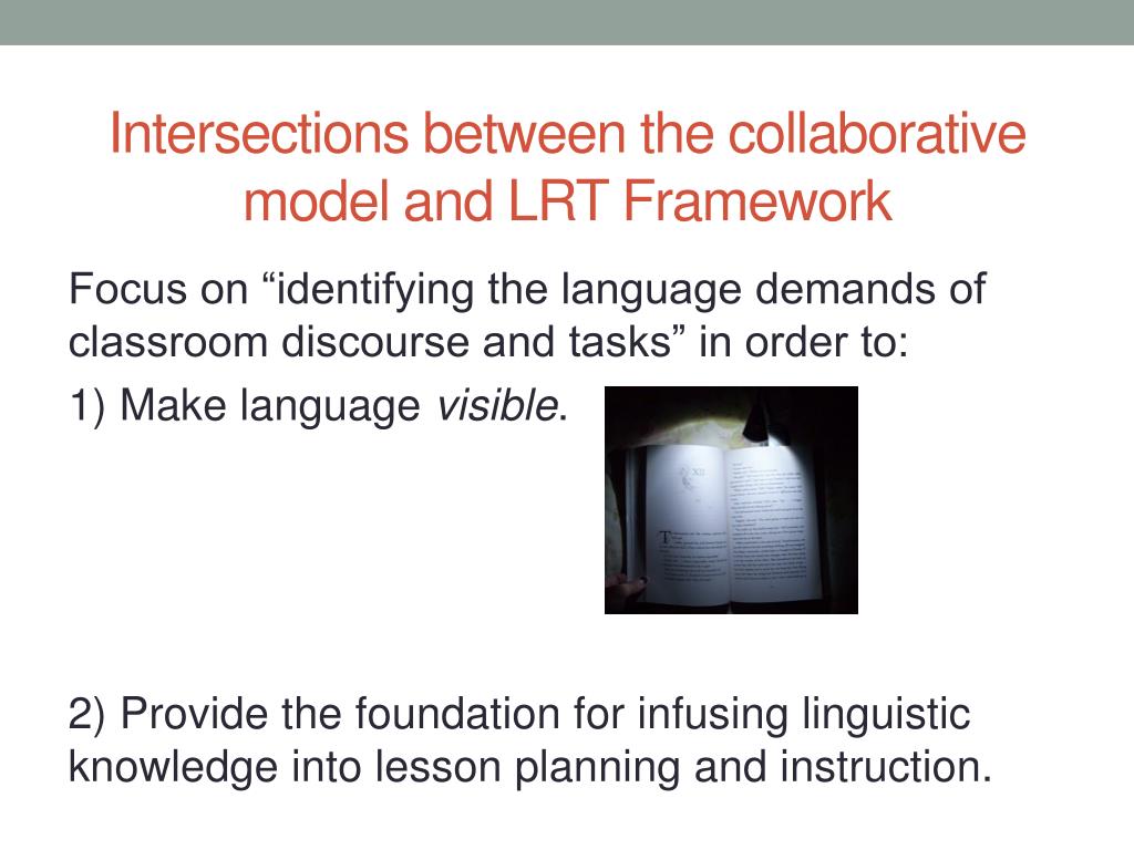 Intersections between the collaborative model and LRT Framework Focus on “identifying the language demands of classroom discourse and tasks” in order to: 1) Make language visible. 2) Provide the foundation for infusing linguistic knowledge into lesson planning and instruction.