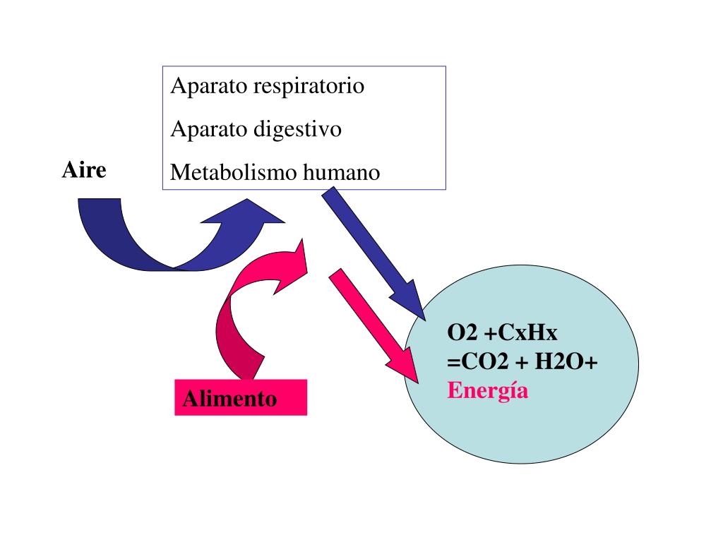 O2 +CxHx =CO2 + H2O+ Energía Aparato respiratorio Aparato digestivo Metabolismo humano Aire Alimento