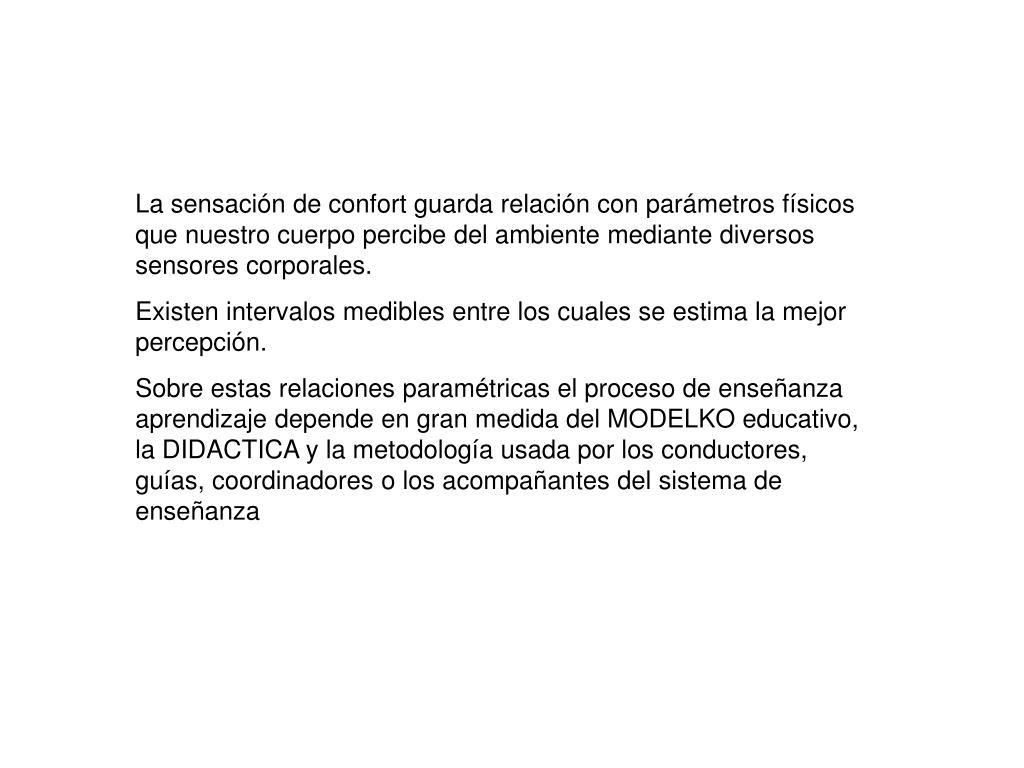 La sensación de confort guarda relación con parámetros físicos que nuestro cuerpo percibe del ambiente mediante diversos sensores corporales. Existen intervalos medibles entre los cuales se estima la mejor percepción. Sobre estas relaciones paramétricas el proceso de enseñanza aprendizaje depende en gran medida del MODELKO educativo, la DIDACTICA y la metodología usada por los conductores, guías, coordinadores o los acompañantes del sistema de enseñanza