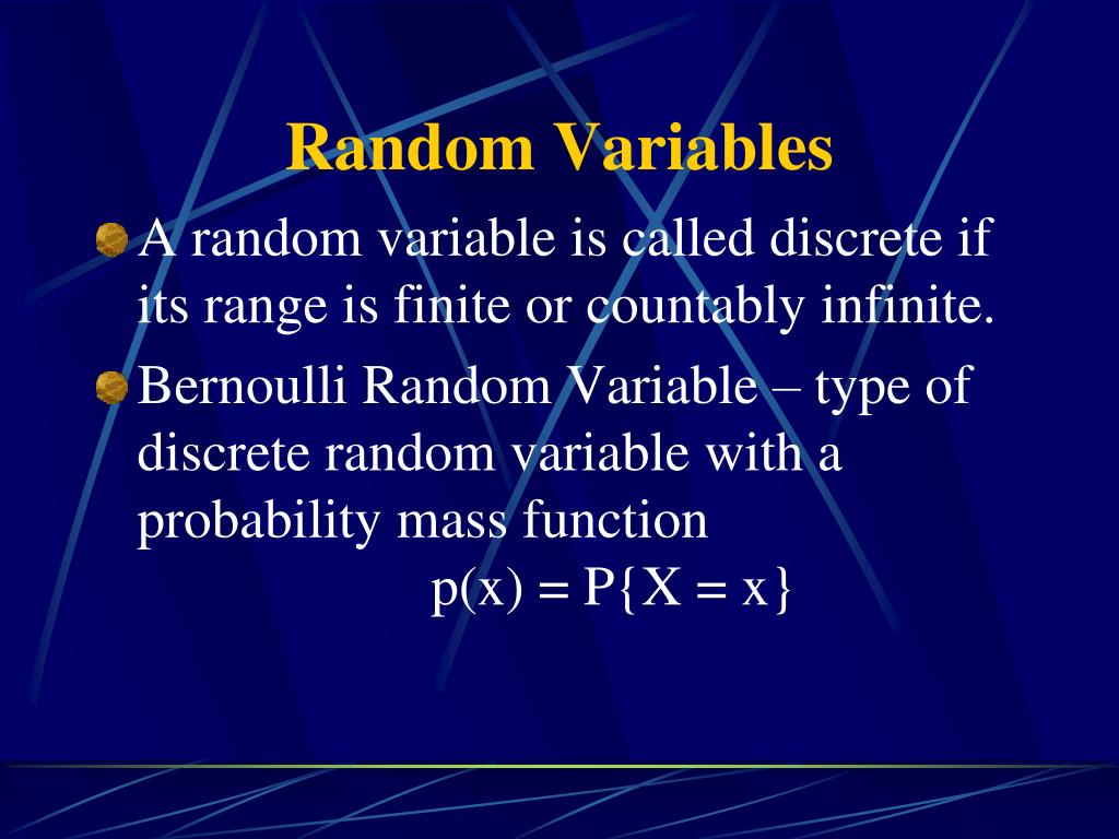 Random Variables • A random variable is called discrete if its range is finite or countably infinite. • Bernoulli Random Variable – type of discrete random variable with a probability mass function p(x) = P{X = x}