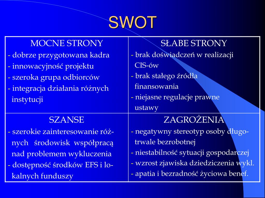 Cel Główny Nadrzędnym celem CIS jest usamo-dzielnienie osób wykluczonych spo-łecznie i wyprowadzenie ich poza system pomocy społecznej poprzez zatrudnienie socjalne realizowanie dzięki zajęciom z reintegracji spo-łecznej i zawodowej.