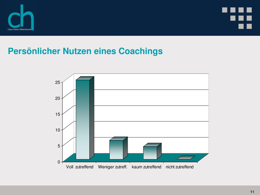 Anforderungen an einen Coach (cdh): Grundhaltung geprägt von Empathie, Echtheit und Engagement Eine fundierte (Coaching-) Ausbildung incl. Toolbox Psychologisches Wissen (incl. Selbsterfahrung) Organisationsverständnis (u.a. systemtheoretische Grundlagen) Lebens- und Berufs-/ Führungserfahrung (Feldkompetenz)