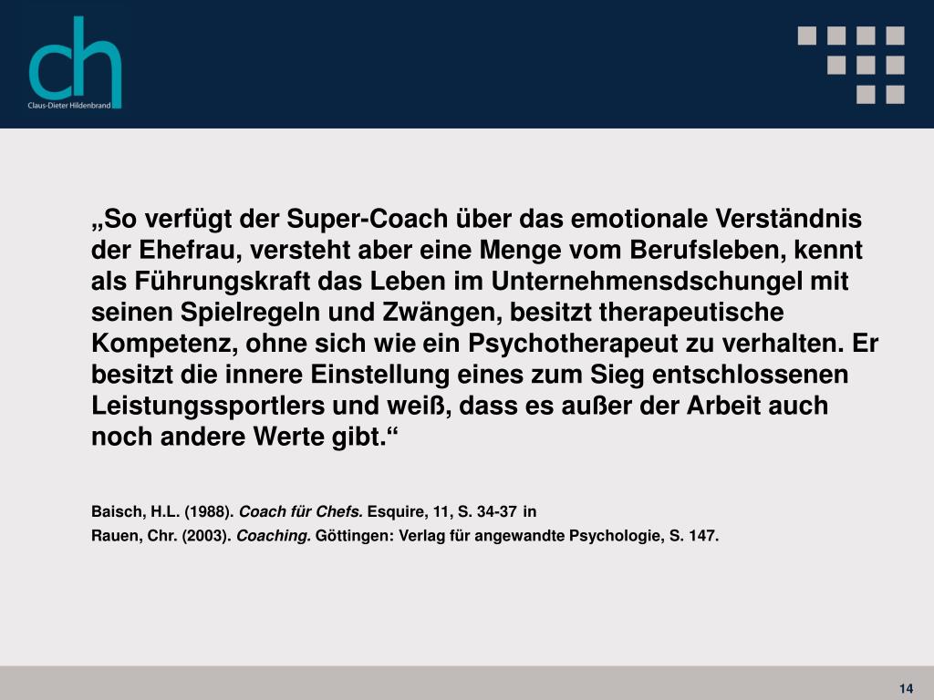 „So verfügt der Super-Coach über das emotionale Verständnis der Ehefrau, versteht aber eine Menge vom Berufsleben, kennt als Führungskraft das Leben im Unternehmensdschungel mit seinen Spielregeln und Zwängen, besitzt therapeutische Kompetenz, ohne sich wie ein Psychotherapeut zu verhalten. Er besitzt die innere Einstellung eines zum Sieg entschlossenen Leistungssportlers und weiß, dass es außer der Arbeit auch noch andere Werte gibt.“ Baisch, H.L. (1988). Coach für Chefs. Esquire, 11, S. 34-37 in Rauen, Chr. (2003). Coaching. Göttingen: Verlag für angewandte Psychologie, S. 147.