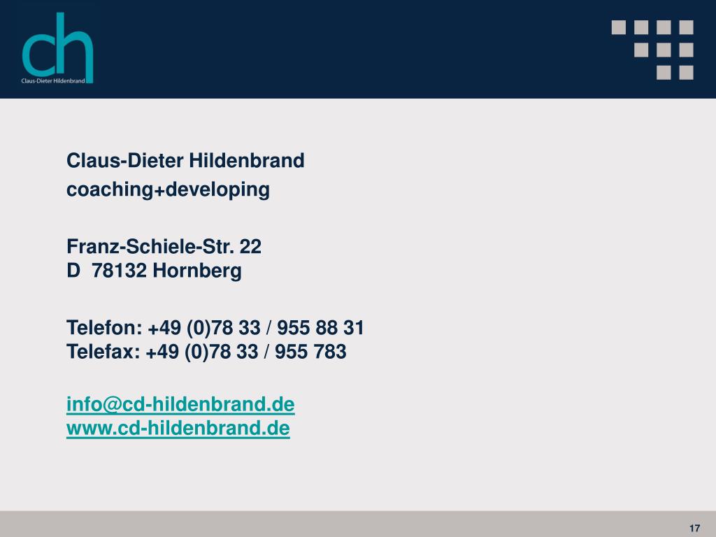 Claus-Dieter Hildenbrand coaching+developing Franz-Schiele-Str. 22D 78132 Hornberg Telefon: +49 (0)78 33 / 955 88 31Telefax: +49 (0)78 33 / 955 783 info@cd-hildenbrand.dewww.cd-hildenbrand.de